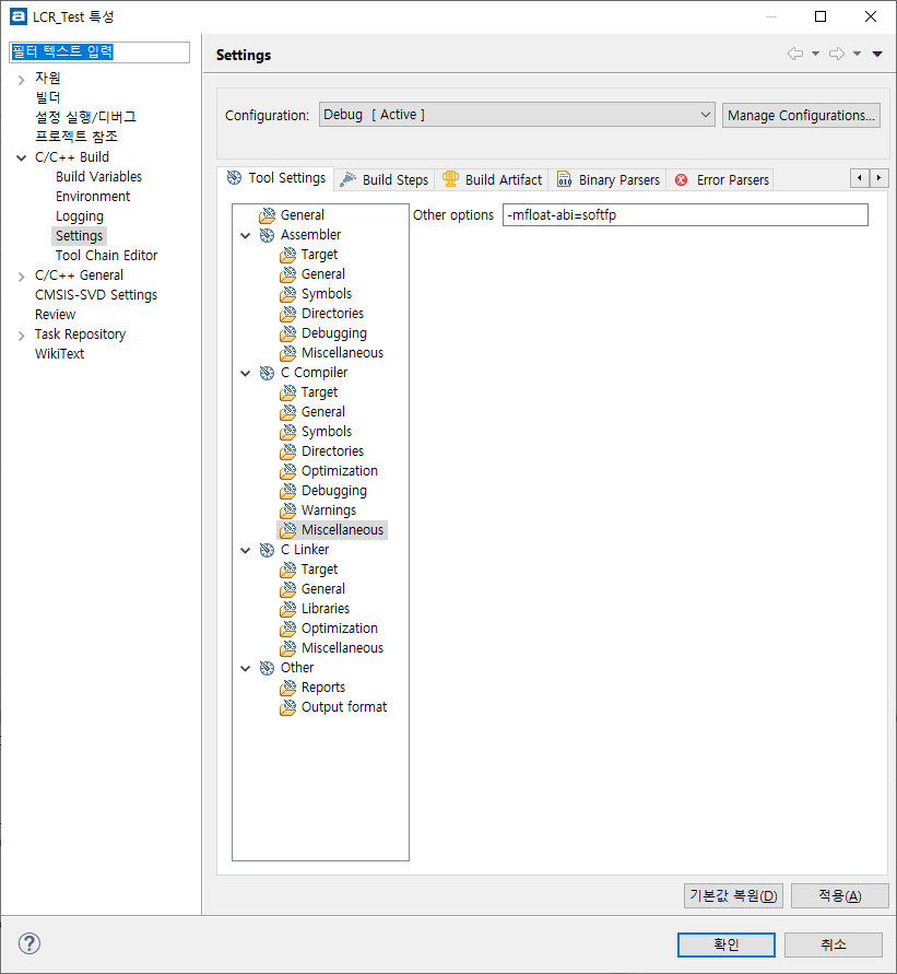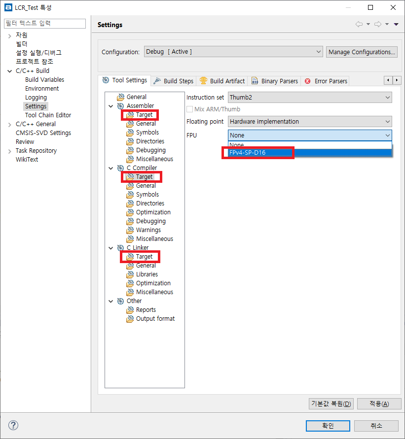 결론: 프로젝트 속성 - Tool Settings에 있는 Assembler, C Compiler, C Linker에 Target FPU 속성을 FPv4-SP-D16으로 설정